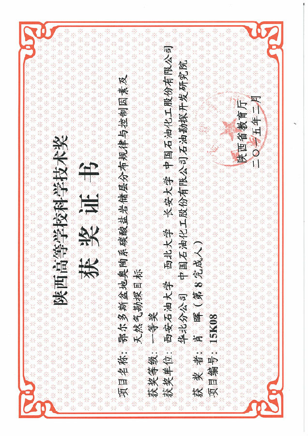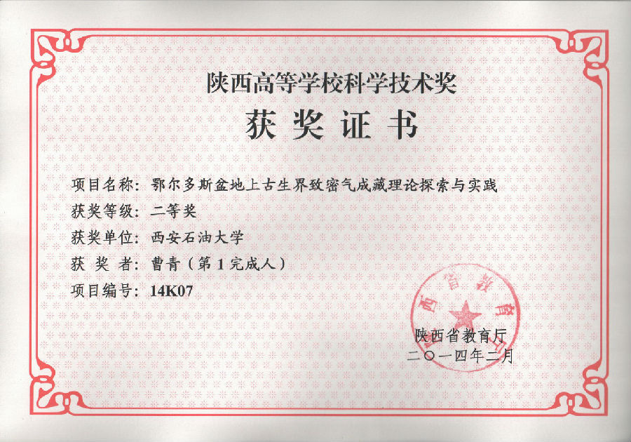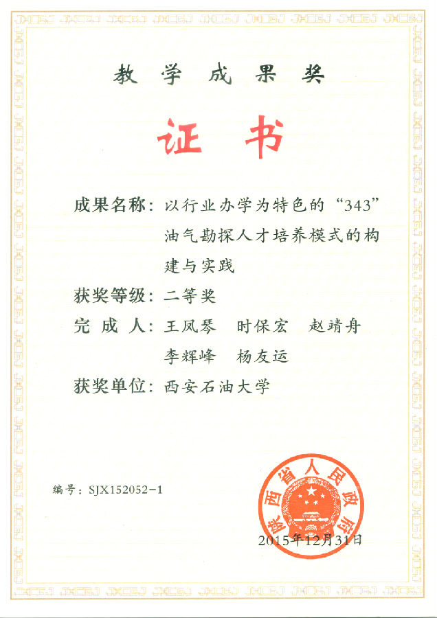 (2)“以行业办学为特色的“343”油气勘探人才培养模式的构建与实践”,获得省级教学成果二等奖(2015.12),该项成果确立了我院油气勘探人才培养的基本模式,明确了培养目标;突显了地球科学与工程学院在油气勘查行业办学特色方面的成绩以及努力的方向。